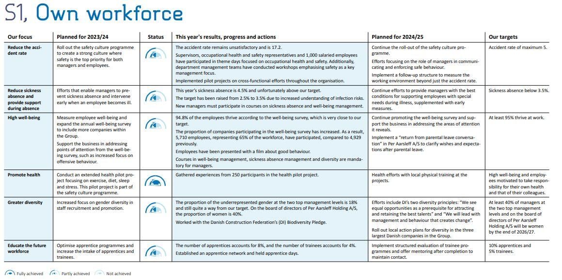 Virksomheder som Nordea og Aarsleff arbejder med systematiske rapporteringsprocesser for at forbedre deres sociale ESG-indikatorer. Det inkluderer løbende evaluering af deres strategi, konkrete indsatser og brug af data til at finjustere indsatsen for bedre resultater. Er indsatserne stadig de rigtige? Når vi de mål, vi har sat?